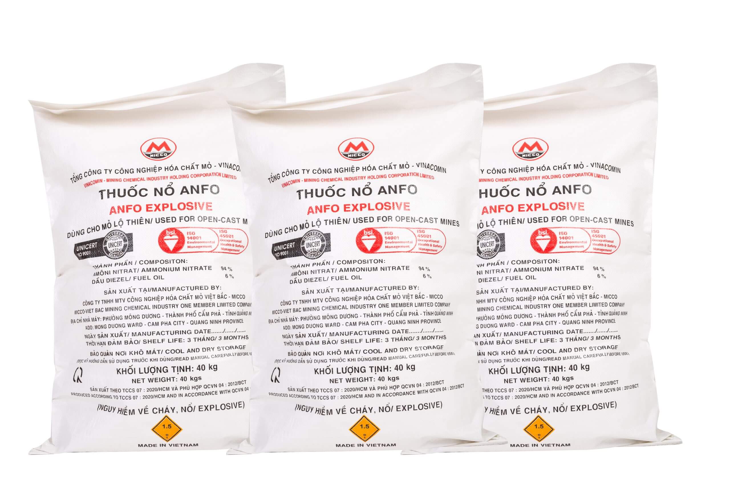 Thuốc nổ ANFO được sáng chế ra năm 1954 ở Mỹ, và ngay sau đó được ứng dụng rộng rãi trên toàn thế giới chỉ trong một thời gian ngắn vì nó đem lại hiệu quả cao, an toàn trong sản xuất, bảo quản, vận chuyển và sử dụng. Thuốc nổ ANFO được Tổng Công ty bắt tay vào nghiên cứu từ năm 1972, đến năm 1979 đã thử nghiệm sản xuất bằng thiết bị trộn bê tông, sau đó đã thử nổ công nghiệp thành công tại khai trường lộ thiên thuộc Công ty Than Hà Tu. Vì những lý do khác nhau mà mãi đến năm 1998 thuốc nổ ANFO mới được Tổng Công ty Công nghiệp Hóa chất mỏ – Vinacomin sản xuất và được phép sử dụng trong công nghiệp theo quyết định số 81/QĐ-CNCL ngày 14/1/1998 và quyết định số 1107/QĐ-CNCL ngày 14/6/1998 của Bộ Công Nghiệp (Nay là Bộ Công Thương). Đối với thuốc nổ ANFO chịu nước: Ngay sau khi Tổng Công ty được thành lập năm 1995, trước tình hình hàng VLNCN viện trợ không còn do Liên Xô sụp đỗ từ năm 1991, với chủ trương của Tổng Công ty lúc đó lấy sản xuất làm gốc, cần thiết phải nghiên cứu để sản xuất thuốc nổ công nghiệp chịu nước dùng cho mỏ lộ thiên nhằm chủ động về thuốc nổ công nghiệp và để đối trọng với thuốc nổ chịu nước P2560 của ICI sản phẩm liên doanh với Australia (do sự độc quyền và không chuyển giao công nghệ của Hãng ICI, không bình đẳng và phân biệt đối xử với cán bộ và công nhân Việt Nam). Từ năm 1995 đến 1997, Tổng Công ty đã nghiên cứu thành công thuốc nổ ANFO chịu nước (chủ nhiệm đề tài là KS. Ngô Văn Tùng nguyên Giám đốc Xí nghiệp Hóa Chất Mỏ Quảng Ninh kiêm Giám đốc Trung tâm VLNCN), đến năm 1998 đề tài đã thành công và chính thức áp dụng vào sản xuất và sử dụng công nghiệp .